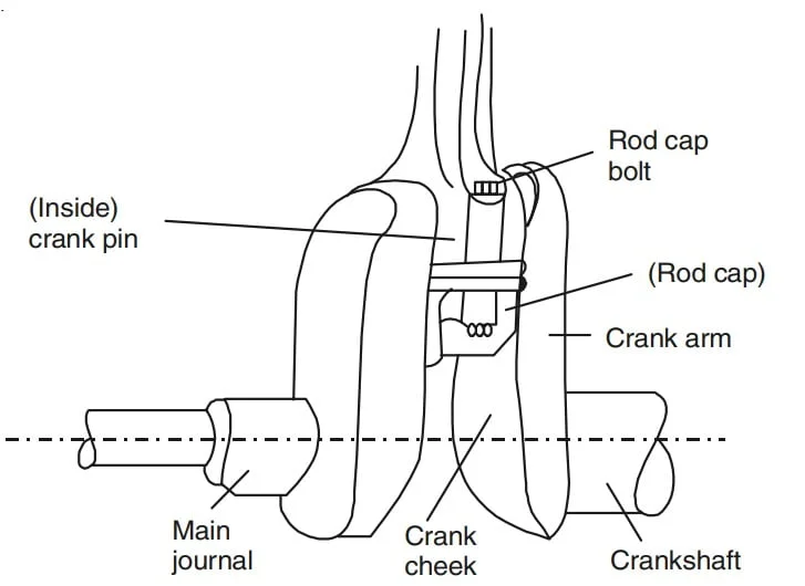- The part of the crank shaft inside the connecting rod bearings is called the crank pin and those inside the main bearings are called the main journals (Fig. 6).