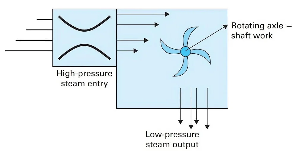 - A turbine (Figure 3) combines nozzles and windmills to convert internal energy into shaft work. It causes significant pressure drops, so high-pressure vapor—usually steam—is needed. Thus, in the Rankine cycle, the turbine receives high-temperature, high-pressure steam as the working fluid.