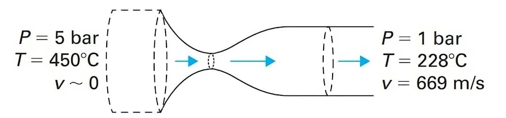 - Figure 2 shows a nozzle where steam enters at 5 bar and 450°C with negligible velocity, then exits at 1 bar and 228°C with a velocity of 669 m/s. The drop in temperature and rise in velocity show internal energy converting into kinetic energy.