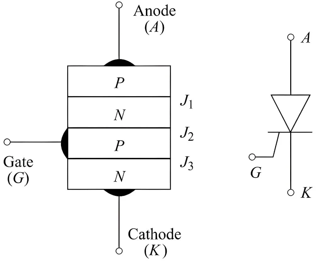 - Figure 1 shows the structure and symbol of a thyristor (SCR). This four-layer PNPN switching device contains three junctions: `J_1` ,`J_2` and `J_3`. It includes three external terminals—anode (A), cathode (K), and gate (G). The anode and cathode connect directly to the main power circuit. The gate terminal conducts a low-level current from gate to cathode. Designers typically place the gate terminal on the P-layer near the cathode, a configuration known as a cathode gate.