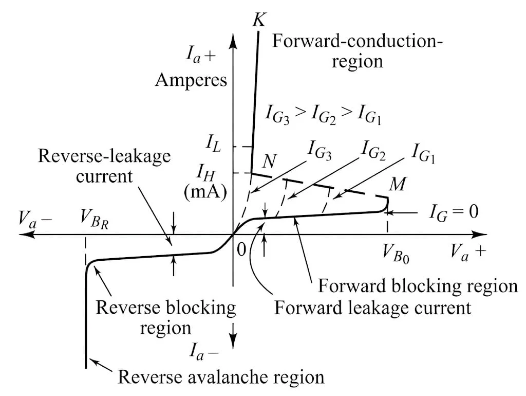 - As forward voltage rises with an open gate, junction `J_2` experiences avalanche breakdown at the forward breakover voltage `V_{BO}`, switching the SCR into a low-impedance, high conduction state. In Fig. 3, point M indicates this ON-state transition.