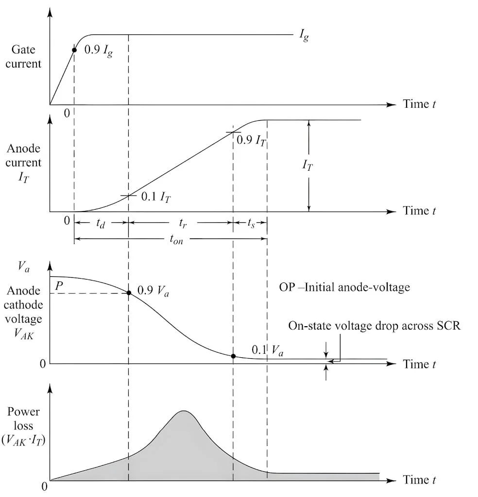 - The turn-on delay denotes a particular timeframe within a thyristor's operating sequence. The timing begins when the gate current achieves 90% of its constant, ultimate magnitude. The timer ceases when the anode current, the principal current within the thyristor, attains one-tenth of its ultimate value.Another way to define this initialization delay centers on how the anode voltage changes. From this view, the turn-on delay is the period where the anode voltage descends from its initial level, designated `V_a`, to a level that is 90% of the original `V_a`.